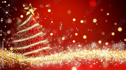 Golden Christmas Tree on Red Background with Festive Lights, Sparkling Xmas Decoration