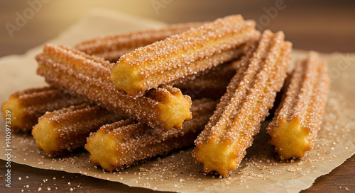Golden churros with cinnamon sugar presented on parchment under light