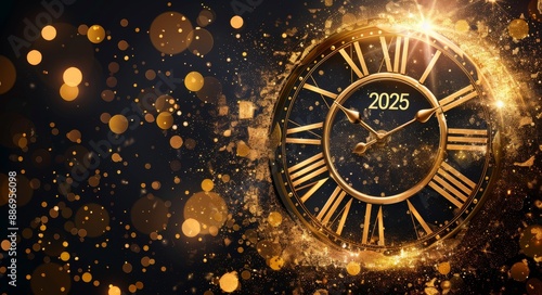 Golden clock face displaying the year 2025 with sparkling lights and golden dust