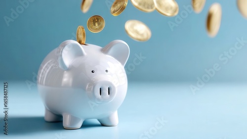 Golden coins falling into white piggy bank on blue background, representing saving money, investment, and growth financial