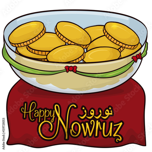 Golden Coins in Crystal Bowl and Red Carpet for Nowruz, Vector Illustration