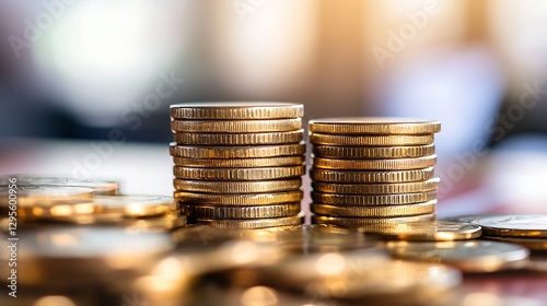 Golden Coins Stacked Neatly on a Surface with Blurred Background : Generative AI