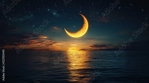 Golden Crescent Moon Over Tranquil Ocean Sunset