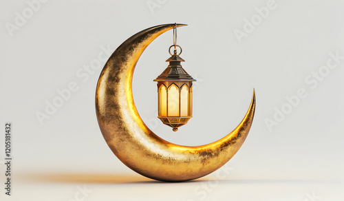 Golden Crescent Moon with Illuminated Lantern: Ramadan Kareem