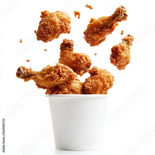 Golden, crispy fried chicken pieces soar through the air, cascading into a classic white bucket. The capture showcases their delightful texture and appetizing appeal, perfect for any feast
