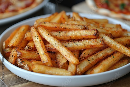 Golden crispy fries piled high in a white bowl Delicious appetizer or side dish ready to be enjoyed with a hot and tasty pizza