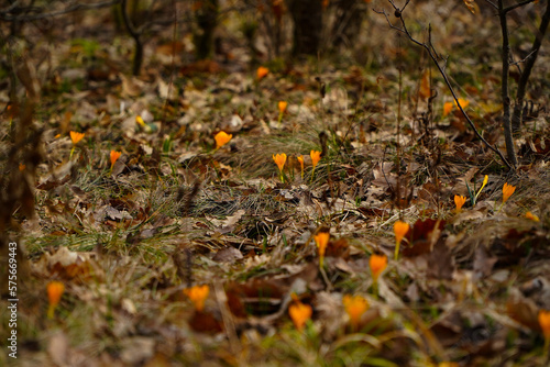 Golden crocus (Crocus chrysanthus) in the forest. Spring. Spring flowers.