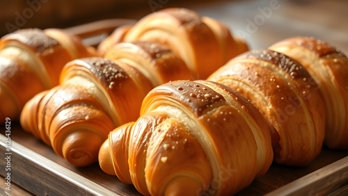 golden croissants arranged neatly on a rustic wooden tray with soft morning light