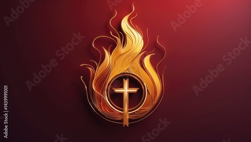 Golden cross framed in stylized flames against a rich burgundy background, symbolizing faith and