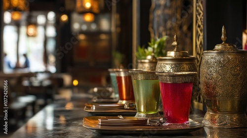 Golden Decor and Refreshing Drinks in a Warmly Lit Restaurant