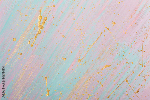 Golden drops and splashes. Hand painted background with wide strokes of blue and pink paint. Place for your design