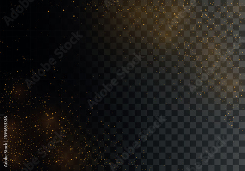 Golden dust light png. Christmas light bokeh confetti and sparkle. The dust sparks and golden stars shine with special light. Glittering stardust background. Glowing glitter of smoke, splashes vector.