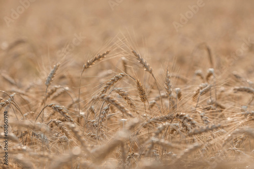 Golden ears of wheat on the background of a ripening field. Agricultural plant close-up. The concept of planting and harvesting a rich harvest. Rural landscape at sunset.