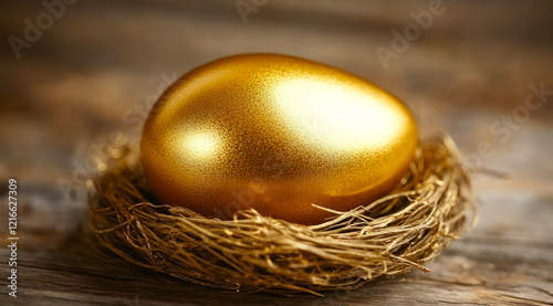 Golden egg nestled in a handmade nest on a rustic wooden background beautifully symbolizing prosperity and aspiration for growth, inviting imagination and creativity in financial journeys