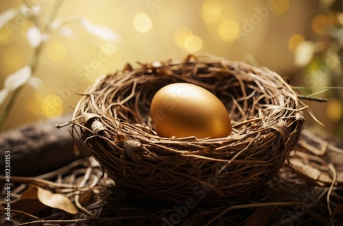 Golden egg rests in bird nest surrounded by blurred background of warm golden hues