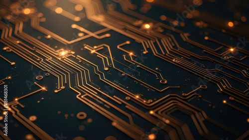 Golden electronic circuit board glowing, connecting digital networks with luminous pathways, representing technological innovation and sophisticated data transmission