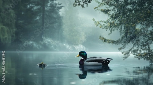 Golden eye duck swimming on serene misty lake surrounded by lush trees in tranquil natural setting at dawn