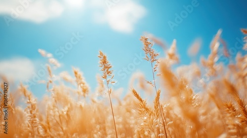 Golden field meets a vibrant blue sky. Warm sunlight bathes the landscape in a peaceful, inviting glow