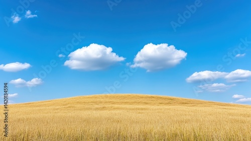 Golden field under a vibrant blue sky. Vast expanse of ripe wheat or barley. Two puffy clouds. Summer landscape
