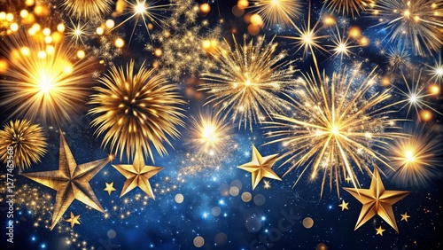 Golden Fireworks and Stars Festive Night Sky Composition, New Year, Celebration Fireworks, New Year's Eve
