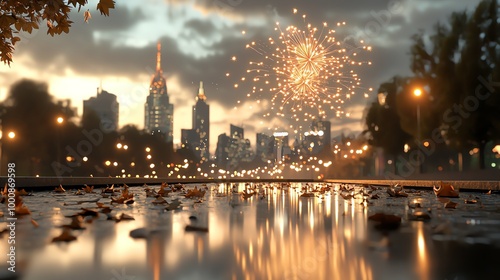 Golden fireworks bursting over a futuristic cityscape, Happy New Year 2025, 3D illustration