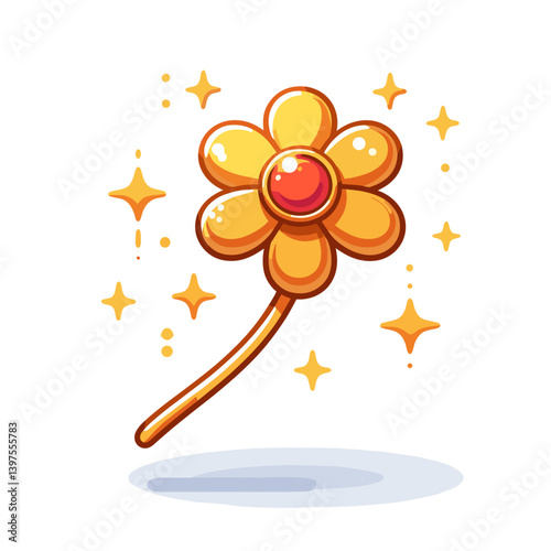 Golden flower wand with sparkles in magical fairytale style. Perfect for fantasy stories, magical accessories and enchanted princess illustrations.