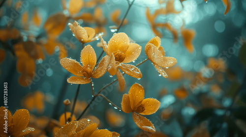 Golden flowers with dew drops, illuminated in a mystical dark forest atmosphere