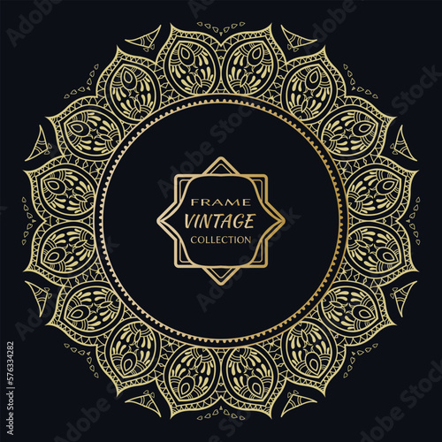 Golden frame template with label and Vintage sign. Decorative line art border, geometric round ornament, linear circular motif. Isolated design element, gold on black background. Elegant fashion lace