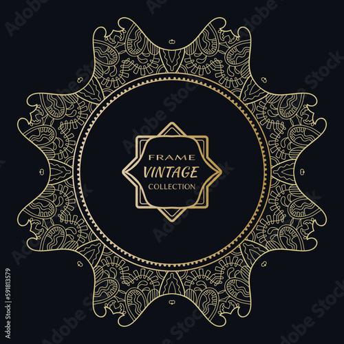 Golden frame template with label and Vintage sign. Decorative line art border, geometric round ornament, linear circular motif. Isolated design element, gold on black background. Elegant fashion lace