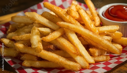 Golden French Fries with Ketchup on Checkered Paper