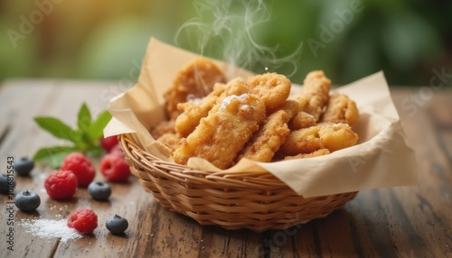 Golden Fried Banana Fritters in Rustic Basket Outdoors