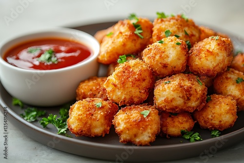 Golden Fried Cauliflower Bites Served on Plate with Tomato Dipping Sauce Bowl Closeup