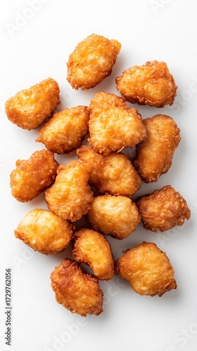 Golden Fried Chicken Nuggets, Crispy Texture on Clean White Background Overhead View