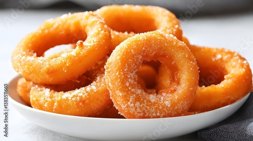 Golden Fried Donuts Coated in Sugar on a White Plate with a Soft Focus Background