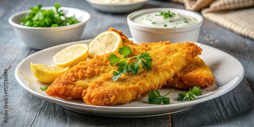 Golden fried fish fillet served with tartar sauce, lemon wedges, and parsley , crispy, delicious, seafood, meal