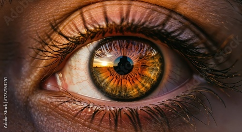 Golden Gaze: A close-up image captures the mesmerizing details of an eye, showcasing the iris's intricate patterns in shades of gold, reflecting the warmth and light.
