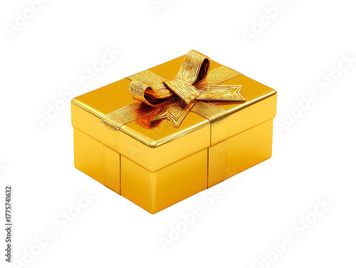 Golden gift box with shiny ribbon, elegant present for celebration, luxury surprise for birthday, anniversary, or holiday, isolated on transparency background, festive and joyful mood