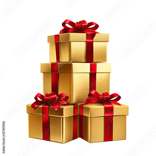 Golden gift boxes with red ribbons, stacked on top of each other, isolated on a Transparent background,
