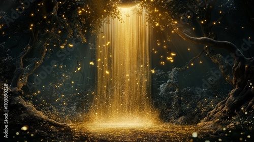 Golden glitter cascades in a dark forest, with dancing fireflies and a glowing full moon.