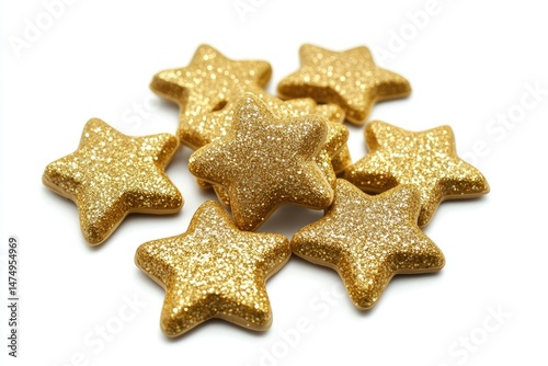 Golden glitter stars cluster. A collection of small, star-shaped decorations, densely packed together, glistening with gold glitter on a white background