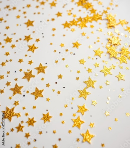 Golden glitter stars confetti scattered on white background, white, effect, glamorous