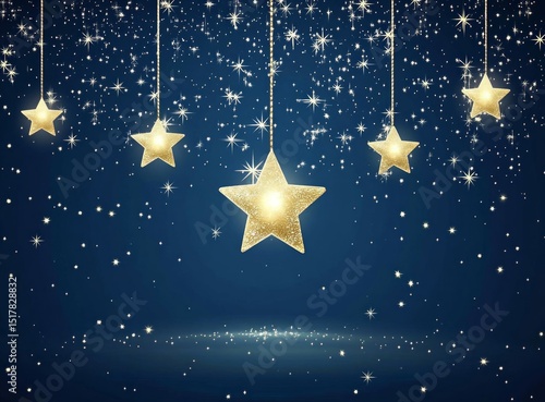 Golden Glitter Stars Hanging Against a Dark Blue Background