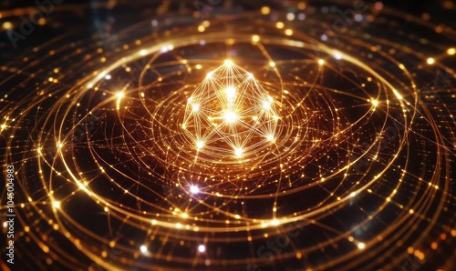 Golden glowing lines and geometric shape.