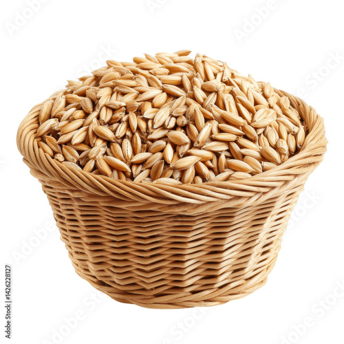 Golden grains fill a woven basket, showcasing the natural beauty of harvested oats in a rustic setting