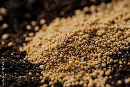 Golden grains of fertilizer nestled in rich, dark soil under soft sunlight. Generative AI