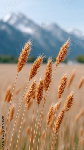 Golden Grass Fields Swaying Under Blue Sky Against Blurred Mountainous Background