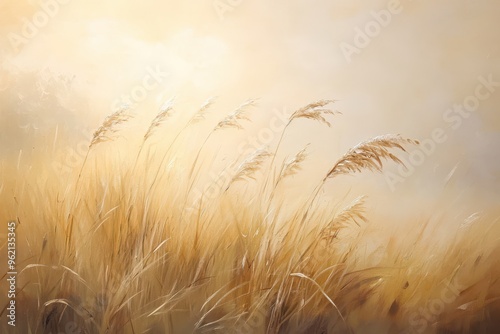 Golden Grass Stalks Swaying in a Misty Meadow