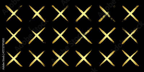 Golden grunge crosses, brush strokes, lines, ink smudges, hand-drawn scribble shapes. Handmade sketchy marks, acrylic stains, charcoal streaks. Paint textures, dry brush effect. Vector illustration