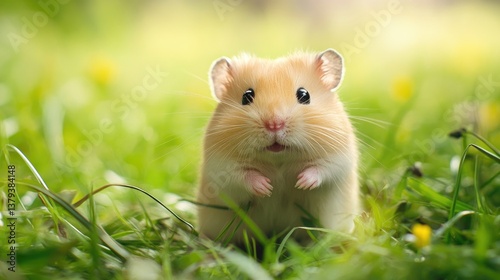 Golden Hamster Standing in Green Grass Looking at Camera Outdoors
