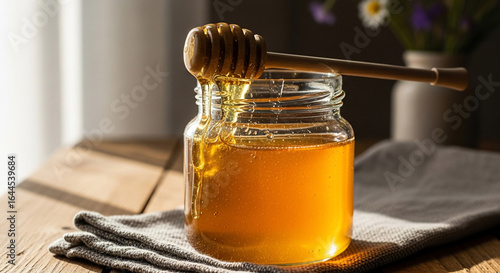 Golden Honey Dripping from Dipper into Glass Jar Natural Sweetness